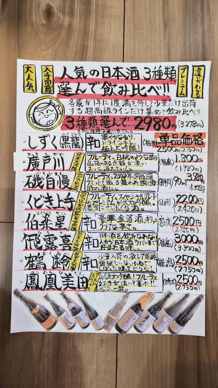 いつもご利用頂き誠にありがとうございます! 函館でも大人気の企画「日本酒3種類選んで呑み比べ!」980円!メニューも毎週入れ替わり年間300種類以上の日本酒が楽しめます! お陰さまで、この企画が美々すすきの本店でも大人気となっております!! 美々すすきの本店では、スタンダードメニューとプレミアムメニューの2種類からお選びできますので是非ご注文下さい!